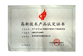 • 普通刨花板生產(chǎn)線(xiàn)高新技術(shù)產(chǎn)品認定證書(shū)
